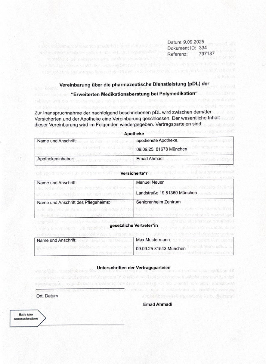 Diese erste Unterschrift ist Voraussetzung, um den gesamten ApoDienste-Prozess zu starten und die Polymedikationsanalysen im Rahmen der Heimversorgung durchführen zu können.