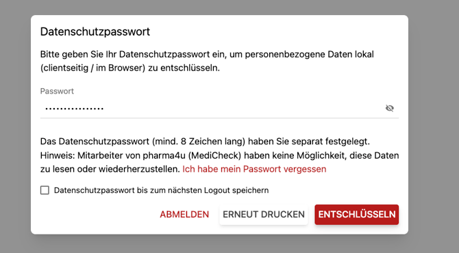 Medicheck wird Ihnen ein PDF zur Verfügung stellen, das den Wiederherstellungsschlüssel enthält.